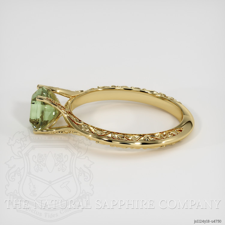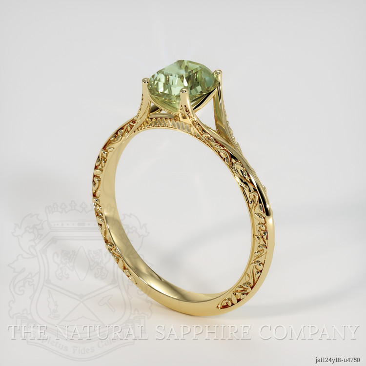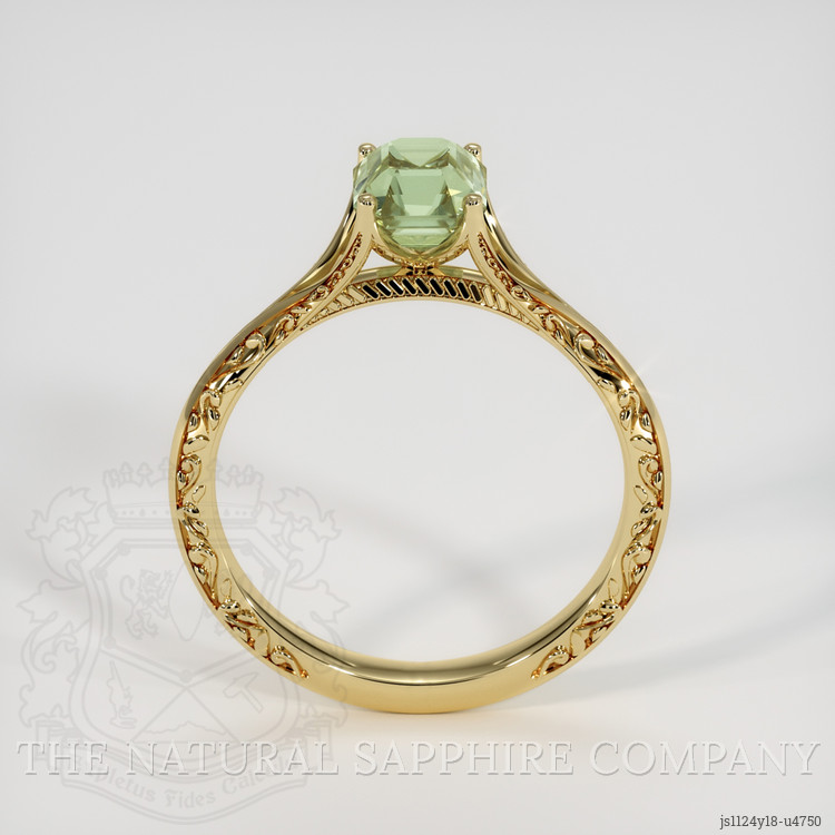 The ring's design exudes an exquisite blend of elegance and meaning. At its heart lies a 1.31 carat emerald cut yellowish green sapphire, symbolizing fidelity and hope. The dimensions of the gemstone, 6.33 x 5.36 x 4.01 mm, highlight its impressive presence. With a clarity grade of very slightly included, the sapphire captures light beautifully, further enhanced by medium color saturation and an excellent polish. The stone's origin, Montana, adds a unique narrative of natural beauty and rugged charm. Set entirely in 18K yellow gold, the ring embodies warmth and opulence. The intricate detailing of the gold band adds an extra layer of sophistication, symbolizing enduring commitment and timeless allure. Each facet and detail converge to create a piece that is both a celebration of nature's artistry and a profound representation of romantic devotion.