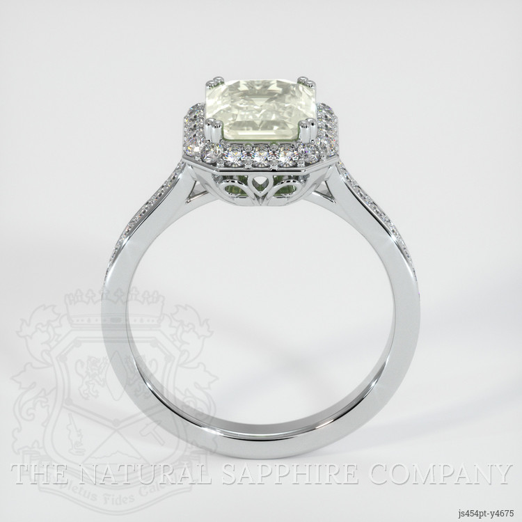 The ring features a beautiful, transparent 1.64 carat emerald cut shape grey sapphire with the dimensions of 7.62 x 6.48 x 3.58 mm and a step cut. It has a clarity grade of very slightly included (evaluated at eye level), faint color saturation, and an excellent polish. The origin of this sapphire is Ceylon (Sri Lanka).