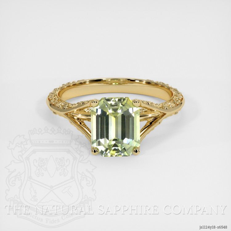 The ring features a beautiful, transparent 2.60 carat emerald cut shape yellowish green sapphire with the dimensions of 8.35 x 6.85 x 4.79 mm and a emerald cut. It has a clarity grade of eye clean (evaluated at eye level), medium light color saturation, and an excellent polish. The origin of this sapphire is Ceylon (Sri Lanka).