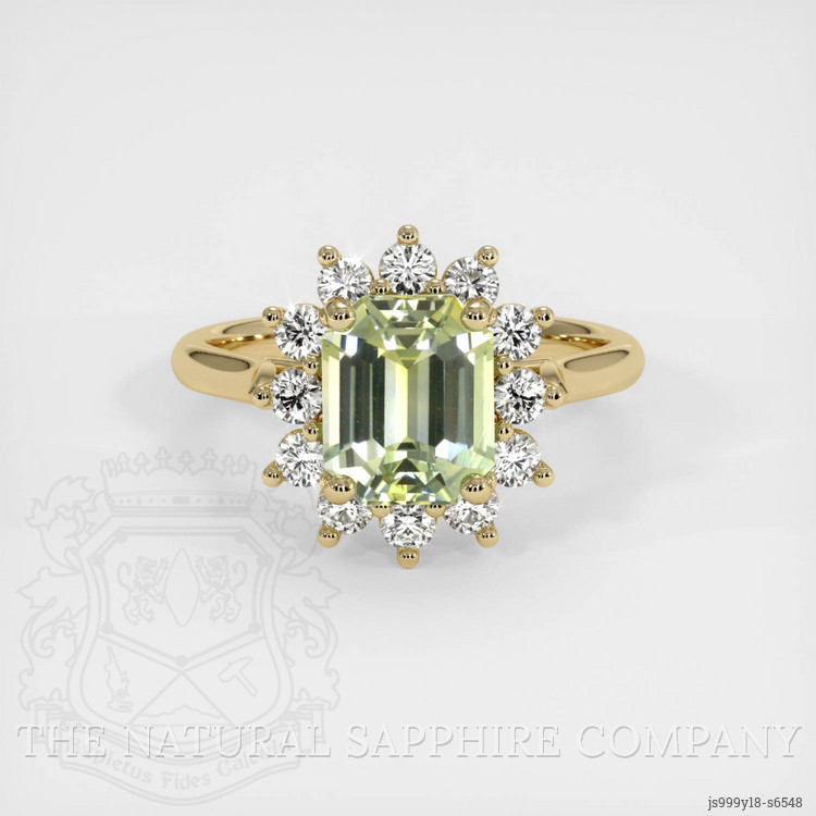 The ring features a beautiful, transparent 2.60 carat emerald cut shape yellowish green sapphire with the dimensions of 8.35 x 6.85 x 4.79 mm and a emerald cut. It has a clarity grade of eye clean (evaluated at eye level), medium light color saturation, and an excellent polish. The origin of this sapphire is Ceylon (Sri Lanka).