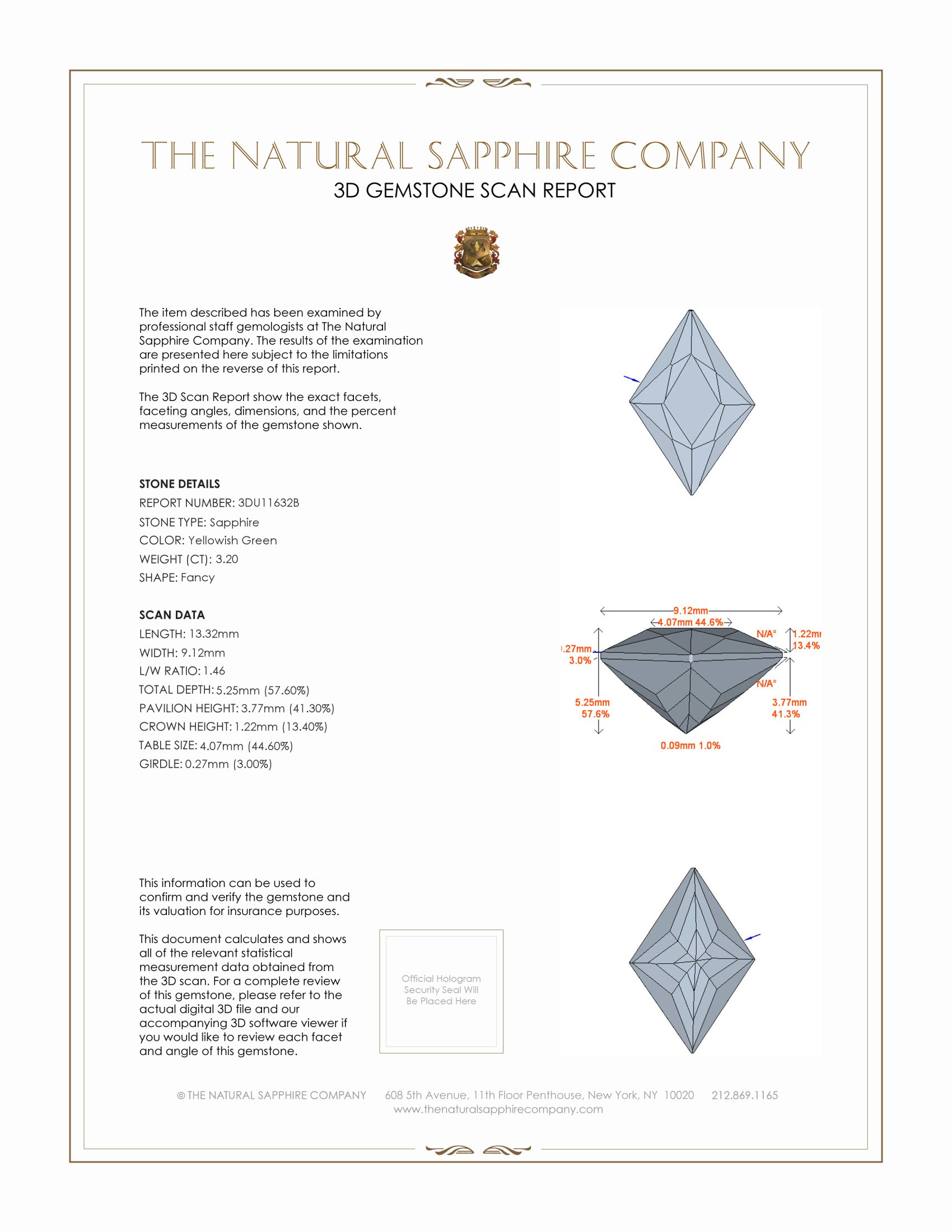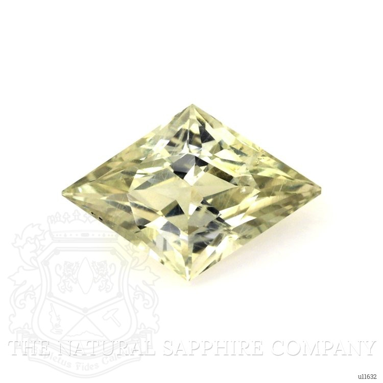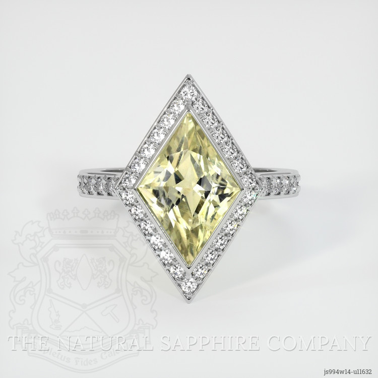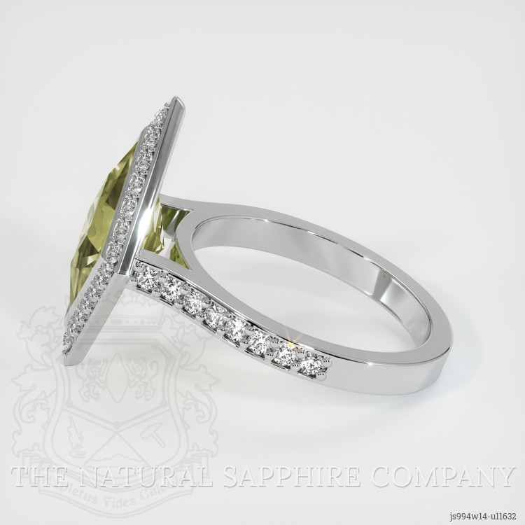 The ring features a beautiful, transparent 3.20 carat fancy shape yellowish green sapphire with the dimensions of 13.32 x 9.12 x 5.25 mm and a fancy brilliant cut. It has a clarity grade of very slightly included (evaluated at eye level), medium intense color saturation, and an excellent polish. The origin of this sapphire is Montana.