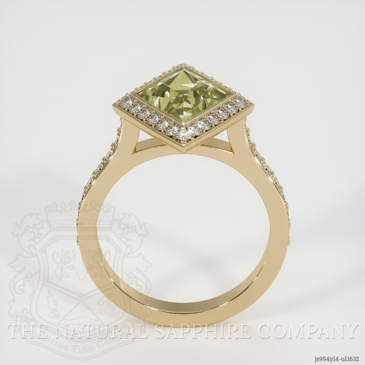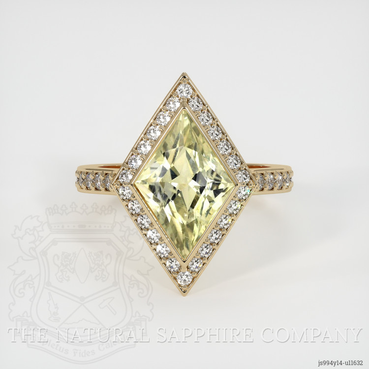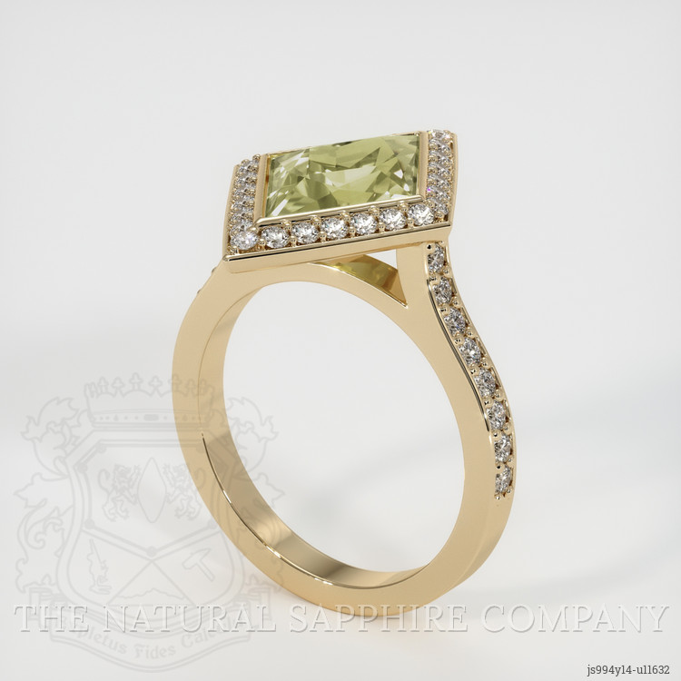 The ring features a beautiful, transparent 3.20 carat fancy shape yellowish green sapphire with the dimensions of 13.32 x 9.12 x 5.25 mm and a fancy brilliant cut. It has a clarity grade of very slightly included (evaluated at eye level), medium intense color saturation, and an excellent polish. The origin of this sapphire is Montana.