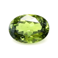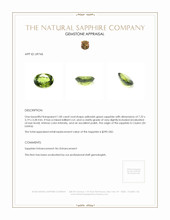 The ring features a beautiful, transparent 1.00 carat oval shape yellowish green sapphire with the dimensions of 7.22 x 5.19 x 3.28 mm and a mixed brilliant cut. It has a clarity grade of very slightly included (evaluated at eye level), intense color saturation, and an excellent polish. The origin of this sapphire is Ceylon (Sri Lanka).