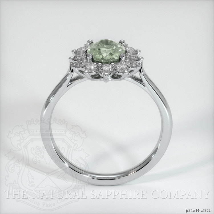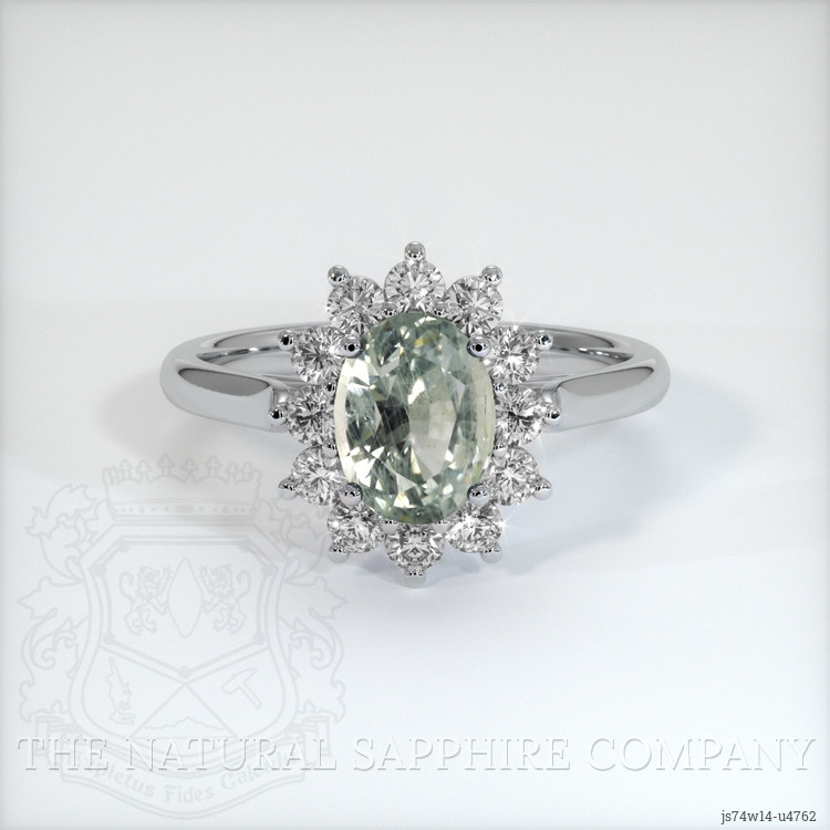 The ring features a beautiful, transparent 1.25 carat oval shape yellowish green sapphire with the dimensions of 6.91 x 5.27 x 4.06 mm and a mixed brilliant cut. It has a clarity grade of very slightly included (evaluated at eye level), medium intense color saturation, and an excellent polish. The origin of this sapphire is Montana.