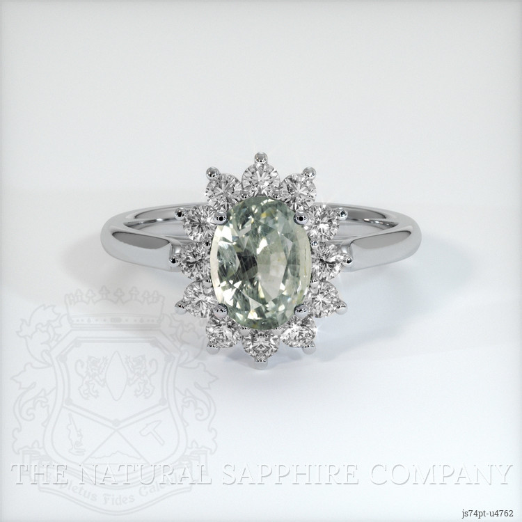 The ring features a beautiful, transparent 1.25 carat oval shape yellowish green sapphire with the dimensions of 6.91 x 5.27 x 4.06 mm and a mixed brilliant cut. It has a clarity grade of very slightly included (evaluated at eye level), medium intense color saturation, and an excellent polish. The origin of this sapphire is Montana.