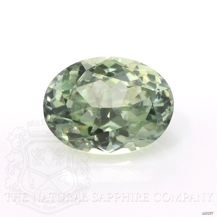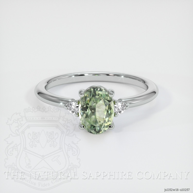 The ring features a beautiful, transparent 1.33 carat oval shape yellowish green sapphire with the dimensions of 7.60 x 5.73 x 3.90 mm and a mixed brilliant cut. It has a clarity grade of very slightly included (evaluated at eye level), medium intense color saturation, and an excellent polish. The origin of this sapphire is Montana.
