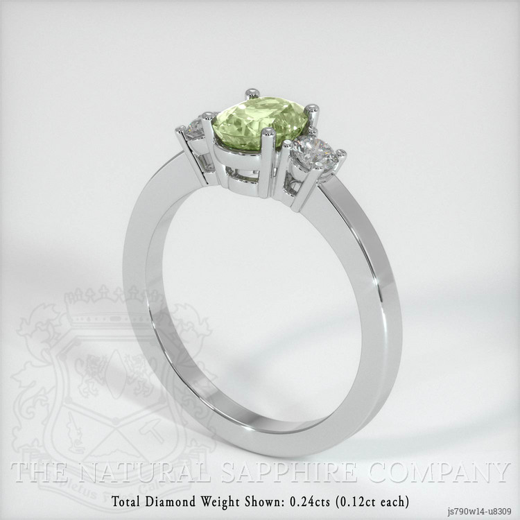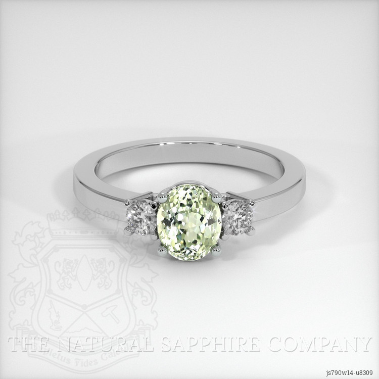The ring features a beautiful, transparent 1.44 carat oval shape yellowish green sapphire with the dimensions of 7.00 x 5.87 x 4.18 mm and a mixed brilliant cut. It has a clarity grade of eye clean (evaluated at eye level), medium light color saturation, and an excellent polish. The origin of this sapphire is Montana.