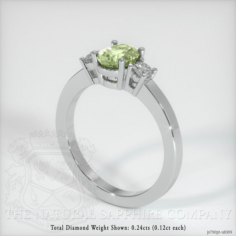 The ring features a beautiful, transparent 1.44 carat oval shape yellowish green sapphire with the dimensions of 7.00 x 5.87 x 4.18 mm and a mixed brilliant cut. It has a clarity grade of eye clean (evaluated at eye level), medium light color saturation, and an excellent polish. The origin of this sapphire is Montana.