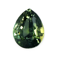 The ring features a beautiful, transparent 2.52 carat pear shape yellowish green sapphire with the dimensions of 8.72 x 6.88 x 5.43 mm and a mixed brilliant cut. It has a clarity grade of very slightly included (evaluated at eye level), vivid color saturation, and an excellent polish. The origin of this sapphire is Tanzania.