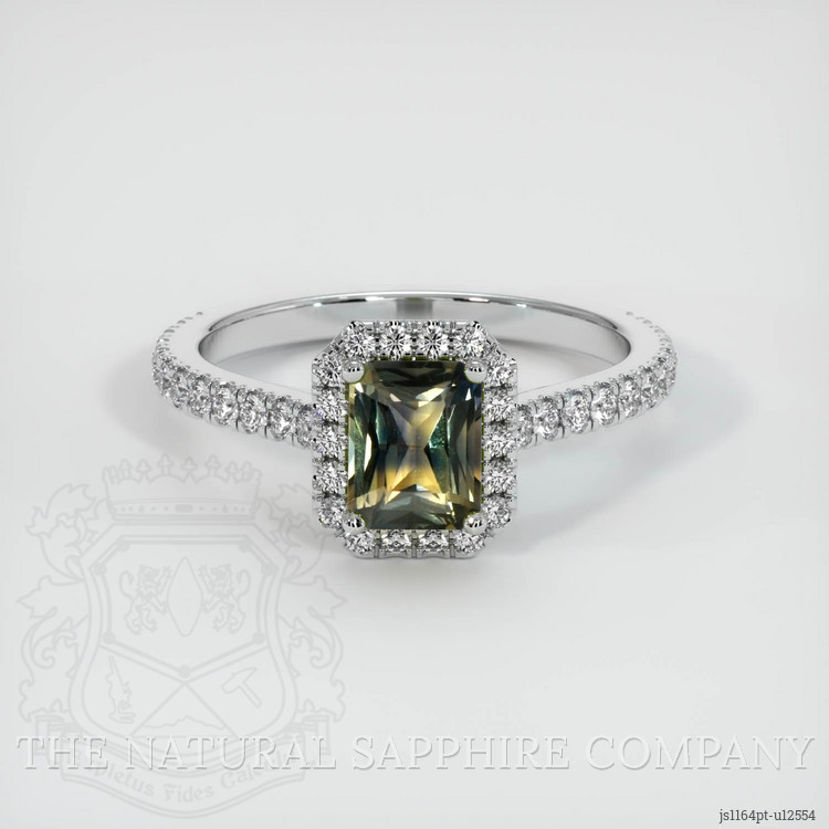 The ring features a beautiful, transparent 0.97 carat radiant shape yellowish green sapphire with the dimensions of 6.13 x 4.82 x 3.22 mm and a radiant cut. It has a clarity grade of very slightly included (evaluated at eye level), intense color saturation, and an excellent polish. The origin of this sapphire is Madagascar.