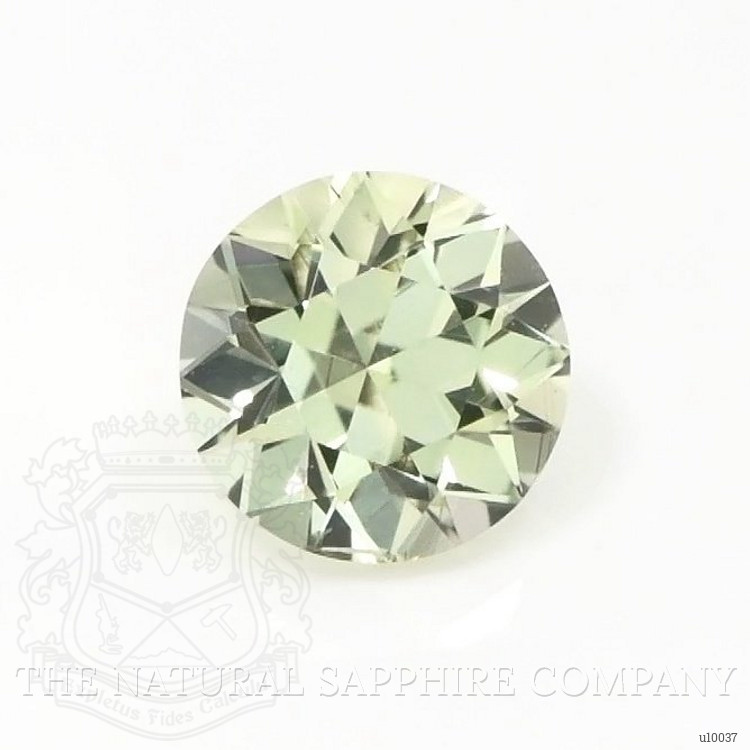 The ring features a beautiful, transparent 0.58 carat round shape yellowish green sapphire with the dimensions of 4.96 x 4.89 x 3.48 mm and a brilliant cut. It has a clarity grade of very slightly included (evaluated at eye level), medium color saturation, and an excellent polish. The origin of this sapphire is Montana.
