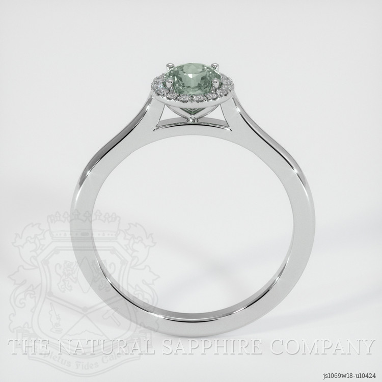 The ring features a beautiful, transparent 0.59 carat round shape yellowish green sapphire with the dimensions of 4.94 x 4.87 x 3.40 mm and a mixed brilliant cut. It has a clarity grade of very slightly included (evaluated at eye level), intense color saturation, and an excellent polish. The origin of this sapphire is Montana.