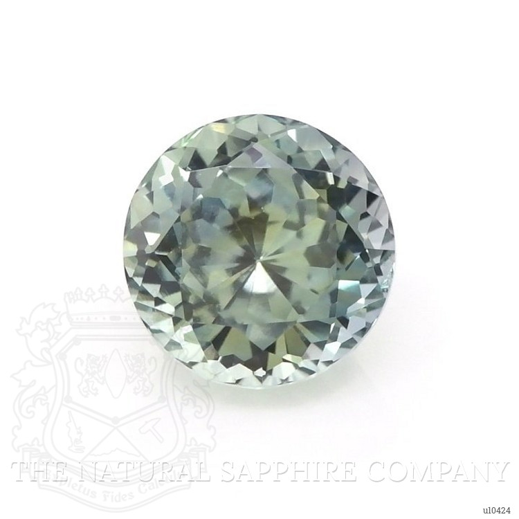 The ring features a beautiful, transparent 0.59 carat round shape yellowish green sapphire with the dimensions of 4.94 x 4.87 x 3.40 mm and a mixed brilliant cut. It has a clarity grade of very slightly included (evaluated at eye level), medium color saturation, and an excellent polish. The origin of this sapphire is Montana.