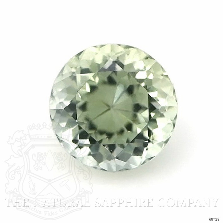 The ring features a beautiful, transparent 0.69 carat round shape yellowish green sapphire with the dimensions of 5.08 x 5.01 x 3.65 mm and a modified brilliant cut. It has a clarity grade of very slightly included (evaluated at eye level), medium color saturation, and an excellent polish. The origin of this sapphire is Montana.