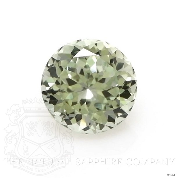 The ring features a beautiful, transparent 0.70 carat round shape yellowish green sapphire with the dimensions of 5.36 x 5.27 x 3.48 mm and a mixed brilliant cut. It has a clarity grade of very slightly included (evaluated at eye level), medium color saturation, and an excellent polish. The origin of this sapphire is Montana.