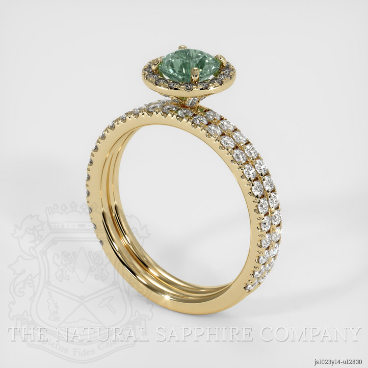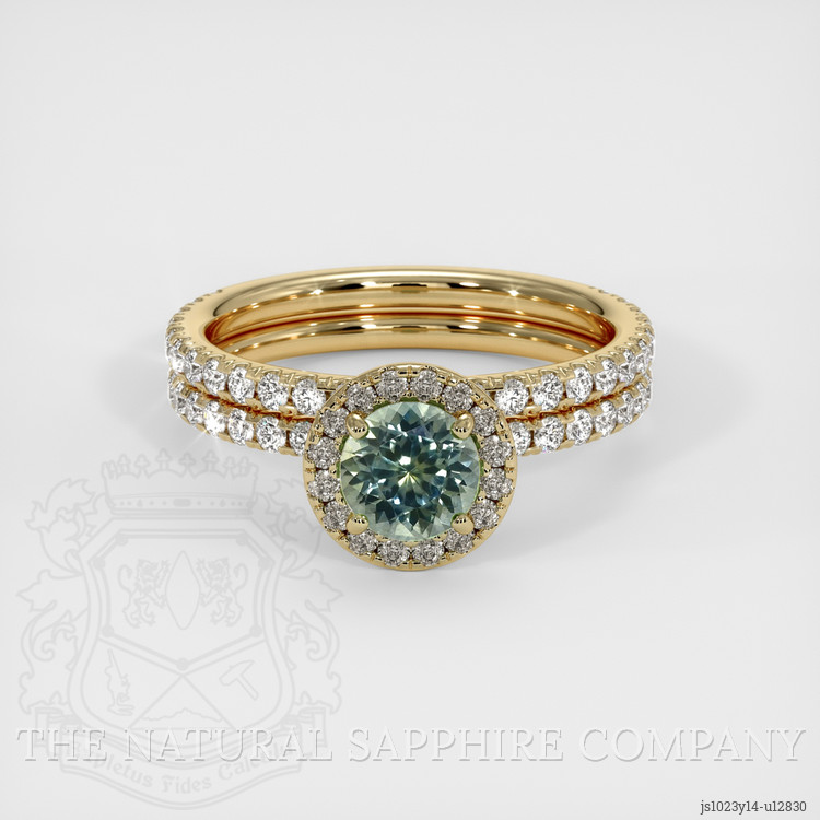 The ring features a beautiful, transparent 0.90 carat round shape yellowish green sapphire with the dimensions of 5.67 x 5.63 x 3.91 mm and a mixed brilliant cut. It has a clarity grade of eye clean (evaluated at eye level), intense color saturation, and an excellent polish. The origin of this sapphire is Montana.