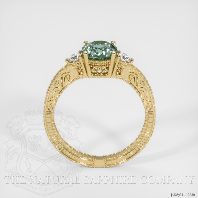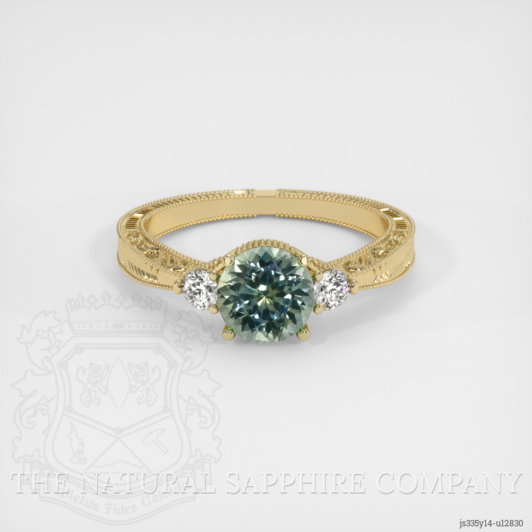 The ring features a beautiful, transparent 0.90 carat round shape yellowish green sapphire with the dimensions of 5.67 x 5.63 x 3.91 mm and a mixed brilliant cut. It has a clarity grade of eye clean (evaluated at eye level), intense color saturation, and an excellent polish. The origin of this sapphire is Montana.