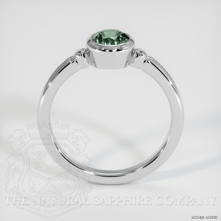 The ring features a beautiful, transparent 0.90 carat round shape yellowish green sapphire with the dimensions of 5.67 x 5.63 x 3.91 mm and a mixed brilliant cut. It has a clarity grade of eye clean (evaluated at eye level), intense color saturation, and an excellent polish. The origin of this sapphire is Montana.