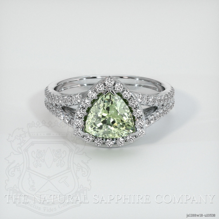The ring features a beautiful, transparent 1.65 carat trillion shape yellowish green sapphire with the dimensions of 6.84 x 7.22 x 4.85 mm and a trillion cut. It has a clarity grade of eye clean (evaluated at eye level), medium color saturation, and an excellent polish. The origin of this sapphire is Montana.