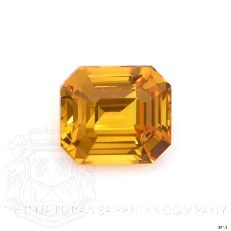 The ring features a beautiful, transparent Other certified Yellowish Orange 2.53 carat asscher - octagon shape yellowish orange sapphire with the dimensions of 7.85 x 6.93 x 4.81 mm and a asscher cut. It has a clarity grade of eye clean (evaluated at eye level), vivid color saturation, and an excellent polish. The origin of this sapphire is Ceylon (Sri Lanka).