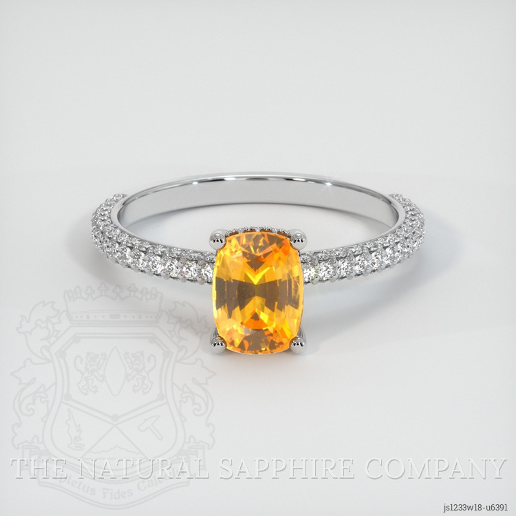 The ring features a beautiful, transparent 1.29 carat cushion shape yellowish orange sapphire with the dimensions of 7.07 x 5.21 x 3.81 mm and a mixed brilliant cut. It has a clarity grade of very slightly included (evaluated at eye level), intense color saturation, and an excellent polish. The origin of this sapphire is Ceylon (Sri Lanka).