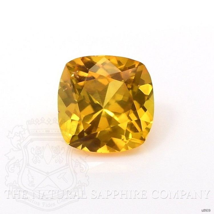 The ring features a beautiful, transparent 1.39 carat cushion shape yellowish orange sapphire with the dimensions of 6.55 x 6.45 x 4.09 mm and a mixed brilliant cut. It has a clarity grade of very slightly included (evaluated at eye level), vivid color saturation, and an excellent polish. The origin of this sapphire is Ceylon (Sri Lanka).
