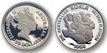 Produced by the Perth Mint, the Australian Koalas are legal tender, but sell at prices that reflect the value of their platinum content, not their face values. Like the Noble, they are issued in 1/20, 1/10, 1/4, 1/2, and one Troy ounce sizes, and have a fineness of .9995.
