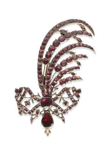 At the height of fashion in the 17th to 18th centuries and then again in the 19th to 20th centuries, the aigrette brooch featured a distinct feather shape and either birds or the allusion to birds. Often set with flat-cut gemstones, the most popular of which was garnet or diamond, the aigrette was very detailed and was often also worn in the hair.