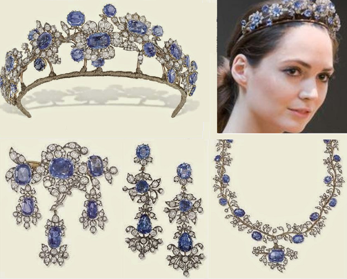 Queen Marie-Amélie had a second sapphire parure, which also included pearls. Created for her by French royal jeweler Bapst from existing jewels in her collection, the tiara features seven oval-shaped blue sapphires said to be of Sri Lankan origin with graduated-diamond surrounds atop diamond festoons accented with pearls and blue sapphires.