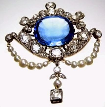 One of the most recognizable pieces in the Danish Crown Jewels, the Connaught sapphire brooch has a long and illustrious history with modern flare. The brooch itself features a large faceted blue sapphire surrounded by various cut diamonds, with swags of pearls suspended from the main element along with a floral diamond and pearl drop.