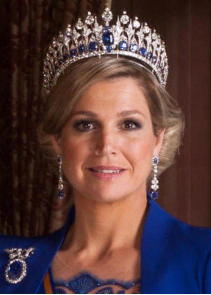 Several of the stones are also mounted en tremblant, meaning they’re attached to a trembler, or a material that acts like a spring, to create movement when worn and reflect the surrounding light. A necklace, earrings, and a brooch were later added to create a parure. Queen Máxima of the Netherlands has streamlined the tiara, redesigning the central diamond element for a more modern look.