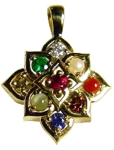 One of the most universal of all amulets is the Navaratna, or “nine gems.” Navaratnas are set with the nine gemstones of Jyotisha, which are known to influence the health and destiny of the wearer. White or colorless sapphires are never used in Navaratnas, because they are only considered as substitute, not primary, planetary gems.
