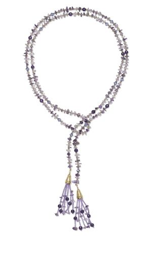 The Art Deco sautoir is a long necklace, usually made of beads, especially pearls, which has a tassel or a pendant at the end. The modern-day sautoir style developed in the early twentieth century as a response to the elongated silhouette created by popular women’s clothing of the time.