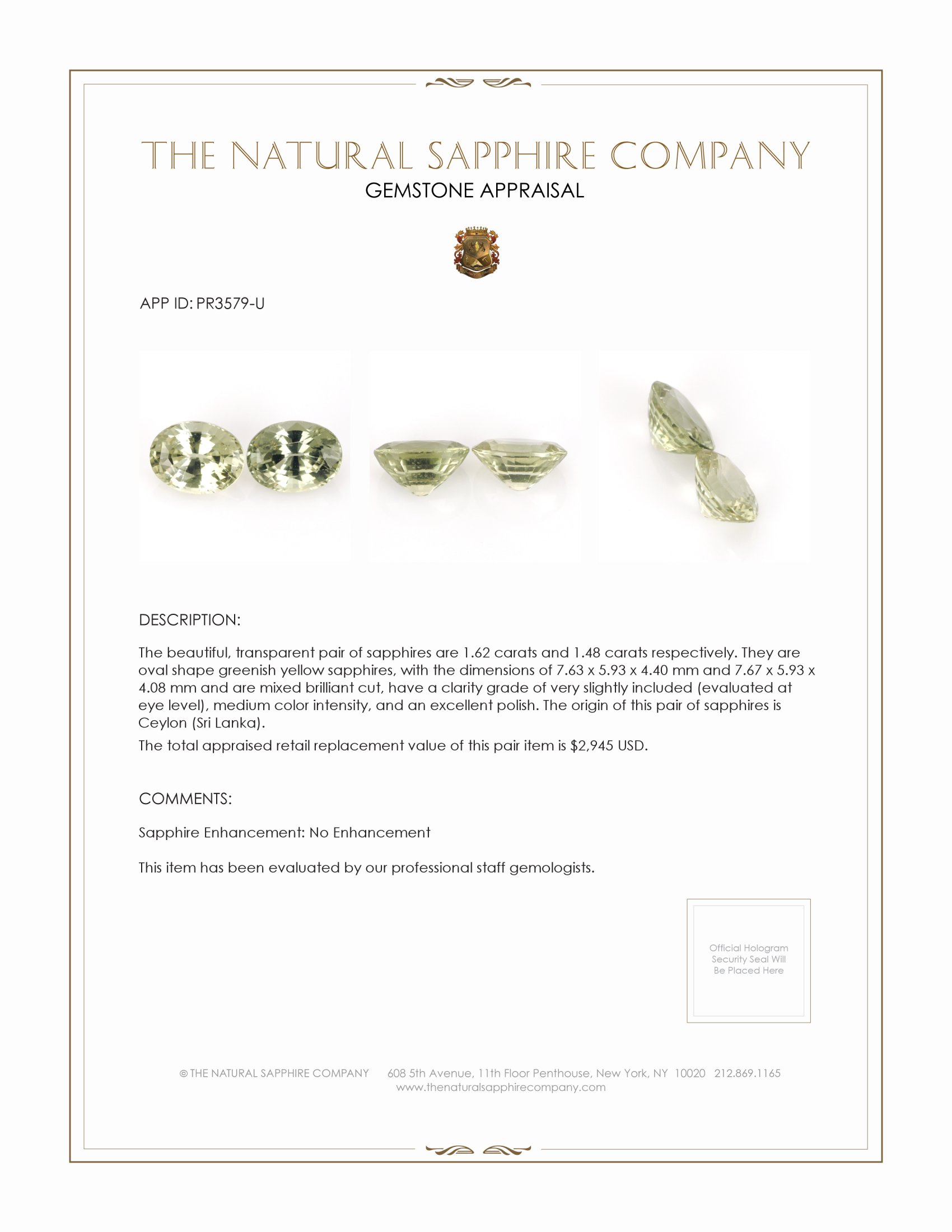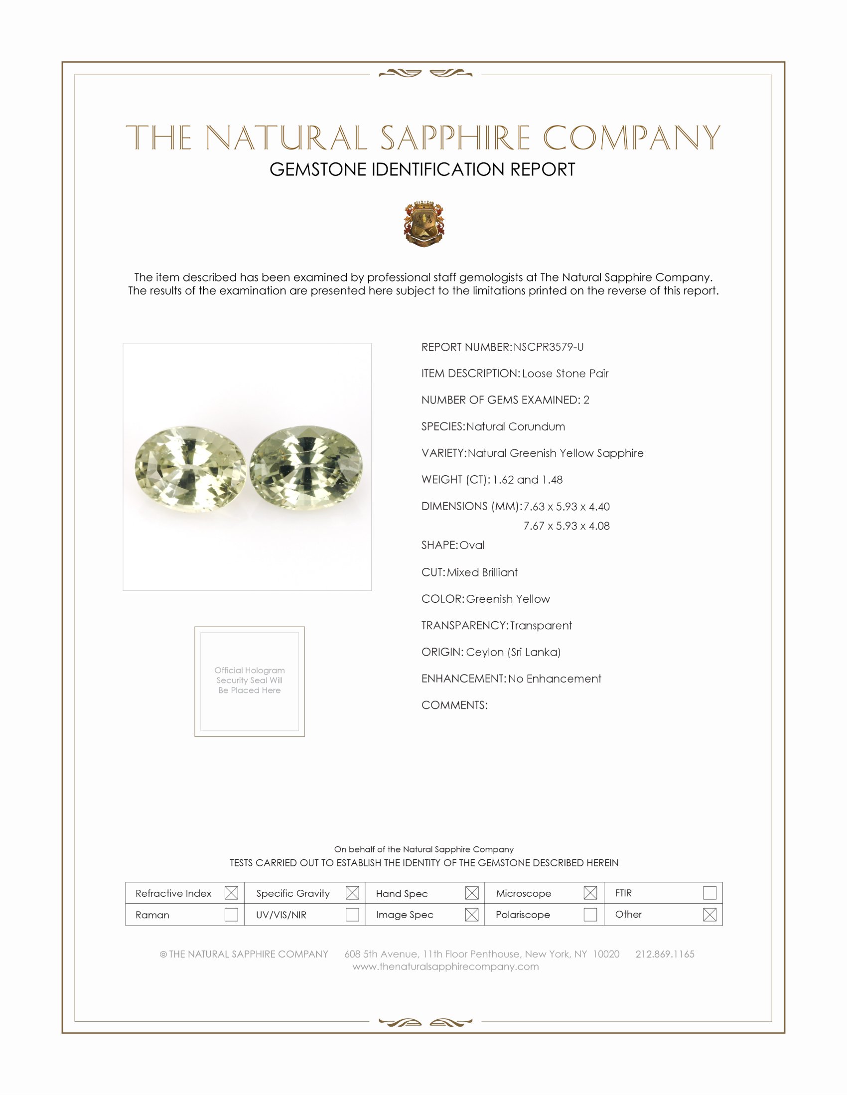 3.10 Ct.Tw.Total Carat Weight Greenish Yellow Sapphire Pair from Ceylon (Sri Lanka)