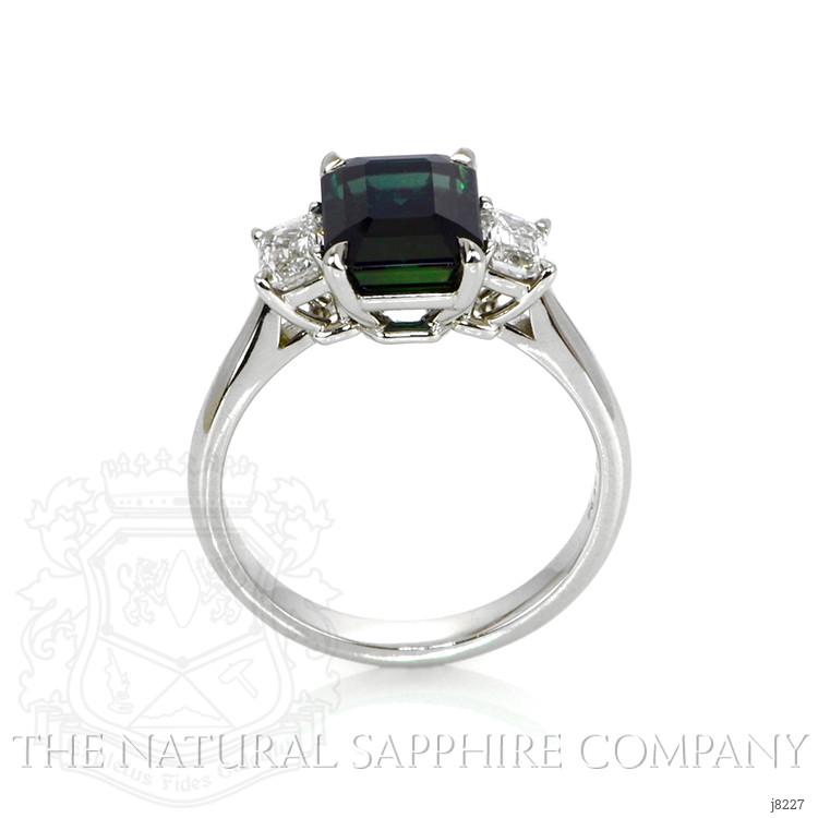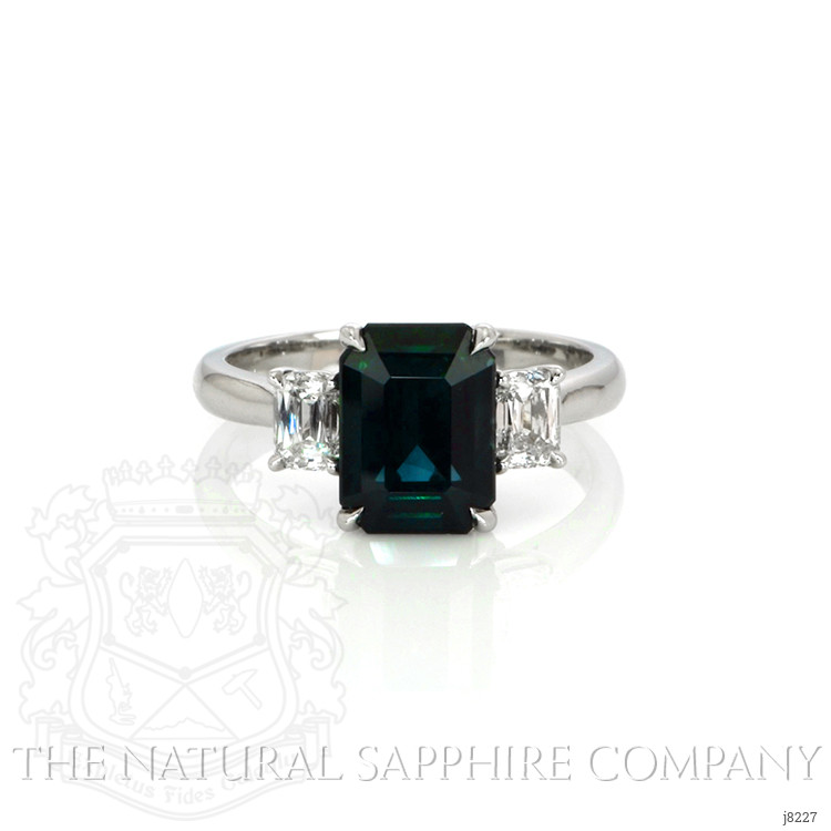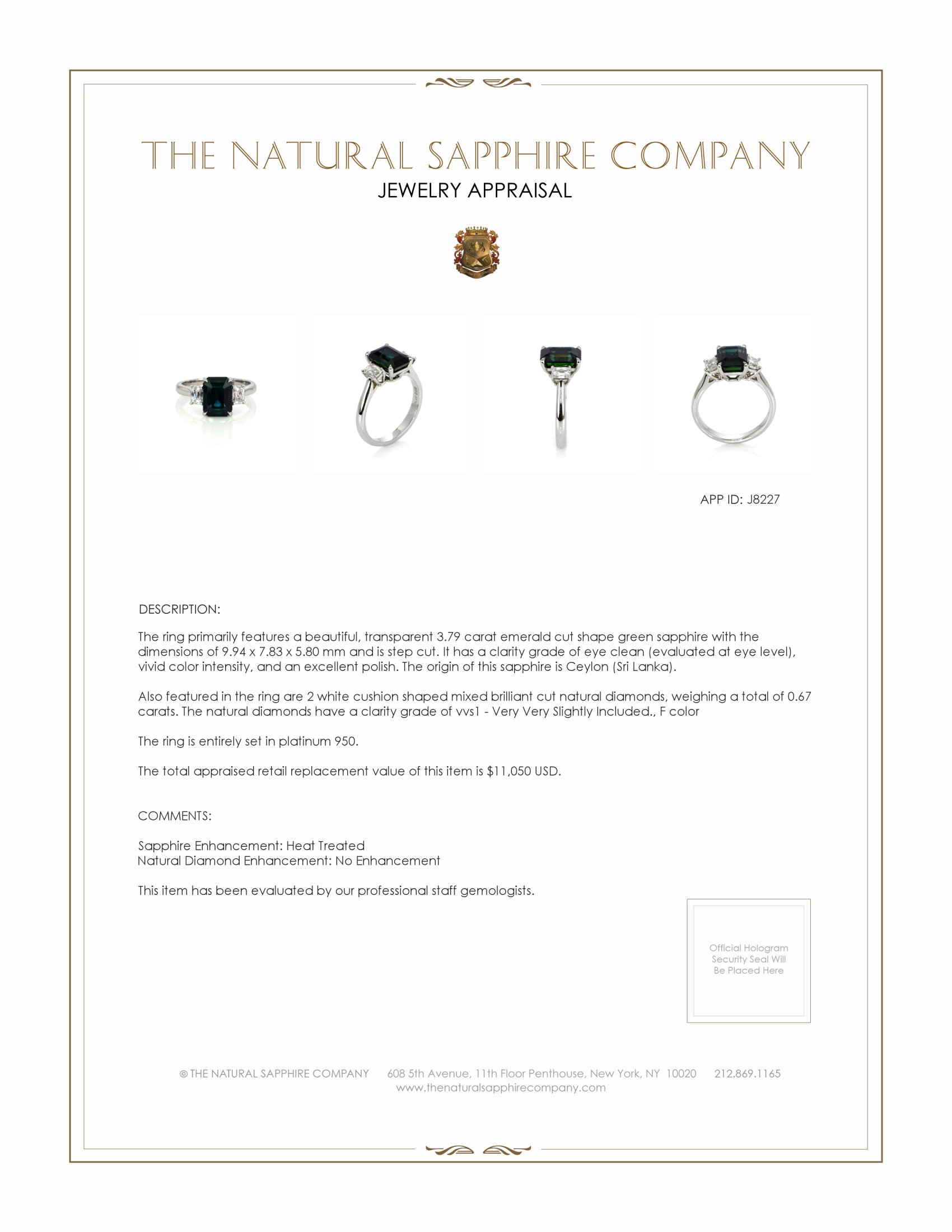 The ring primarily features a beautiful, transparent 3.79 carat emerald cut shape green sapphire with the dimensions of 9.94 x 7.83 x 5.80 mm and is step cut. It has a clarity grade of eye clean (evaluated at eye level), vivid color intensity, and an excellent polish. The origin of this sapphire is Ceylon (Sri Lanka). Also featured in the ring are 2 white cushion shaped mixed brilliant cut natural diamonds, weighing a total of 0.67 carats. The natural diamonds have a clarity grade of vvs1 - Very Very Slightly Included., F color The ring is entirely set in platinum 950.
