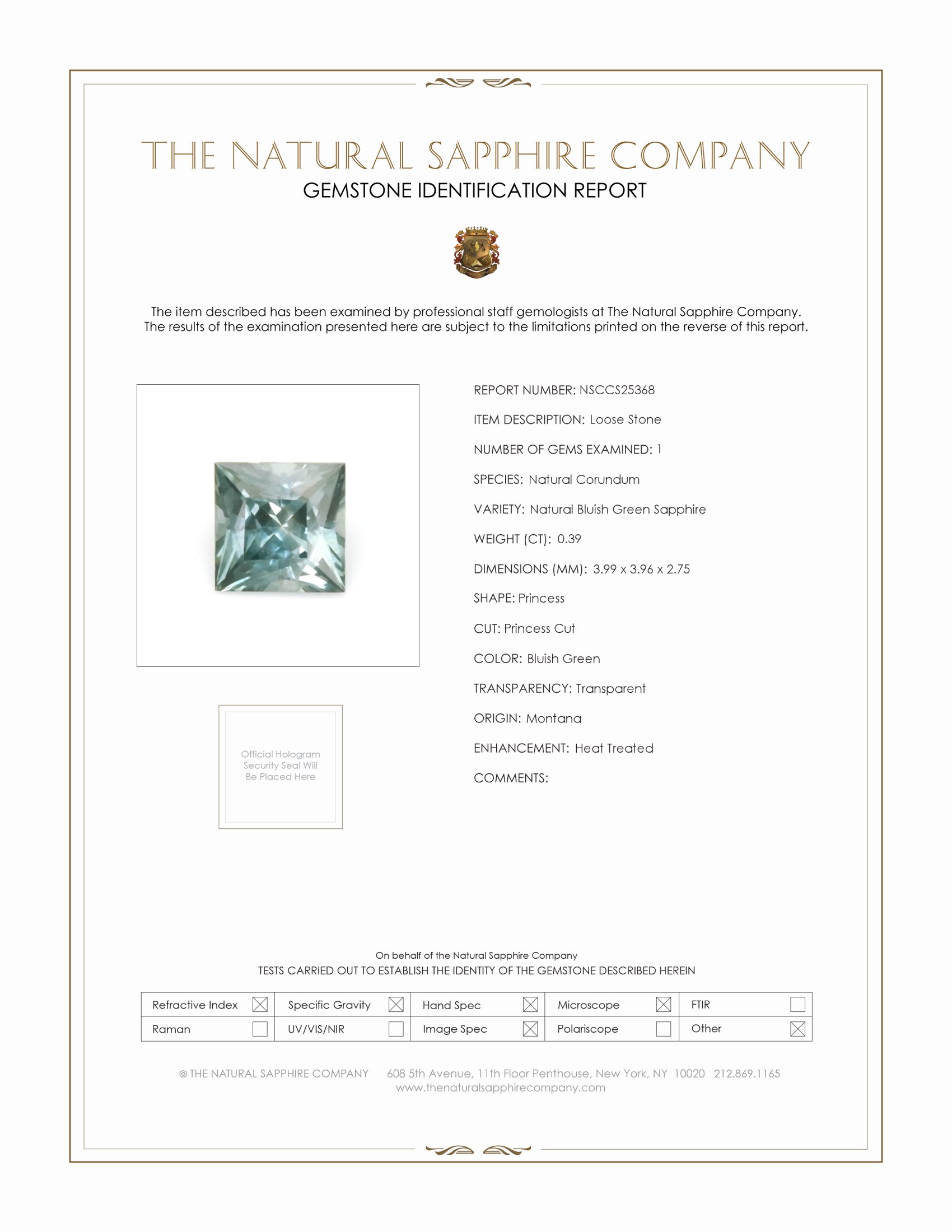 In an ever-changing world, where mass production often overshadows uniqueness, The Natural Sapphire Company invites you to explore a realm where elegance meets exclusivity. We present a breathtaking gem, a 0.39 carat princess shape bluish green sapphire, a treasure of such rarity that it sets itself apart in the vast ocean of commonplace adornments. Every facet of this gemstone tells a story of unparalleled craftsmanship, beginning with its striking dimensions of 3.99 x 3.96 x 2.75 mm, enhanced meticulously with a princess cut. The clarity of this treasure, graded as very slightly included, reveals the sapphire's full beauty, appreciated profoundly when viewed at eye level. The gem radiates a medium intense color that dances in the light, reflecting the tranquility of hidden Montana pistes where it was discovered. Each sapphire is unique, and none more so than this, boasting an excellent polish that dazzles the eye and warms the spirit.