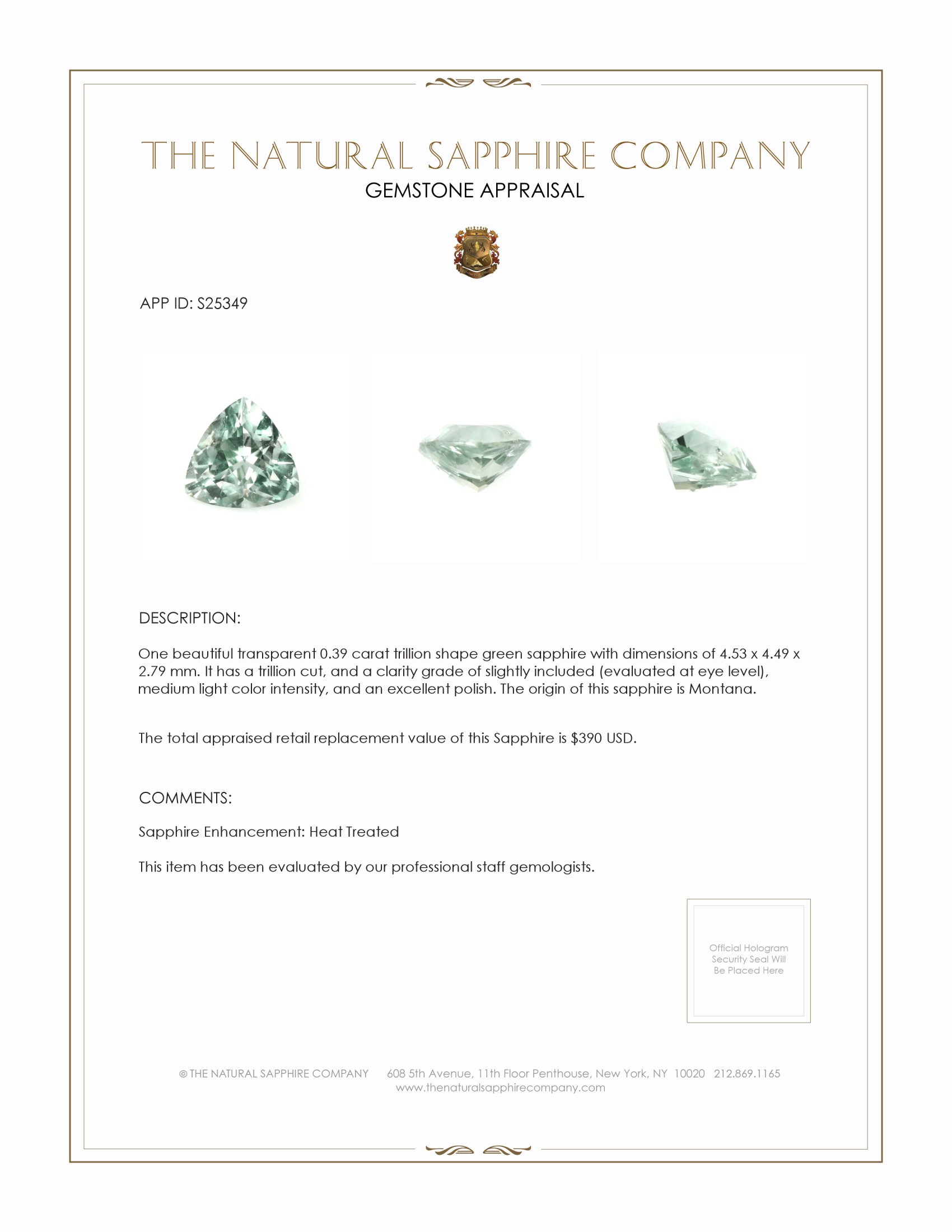 Beaming with an ethereal glow, our 0.39 carat green sapphire is a marvel of nature's handiwork. Its trillion shape confers an intriguing silhouette, dimensions precisely measured at 4.53 x 4.49 x 2.79 mm. This careful manifestation of nature is accentuated by a medium light color intensity, setting it apart with its delicate yet lively aura. Our gemstone carries a clarity grade of slightly included, which at eye level serves only to enhance the stone’s rich narrative. Rather than detracting, these fissures and particles are the silent records of its natural formation process, a signature left by its origin. In every facet polished to perfection, the gemstone celebrates its lineage from Montana’s mineral-rich landscapes, embodying the rugged beauty of its source.