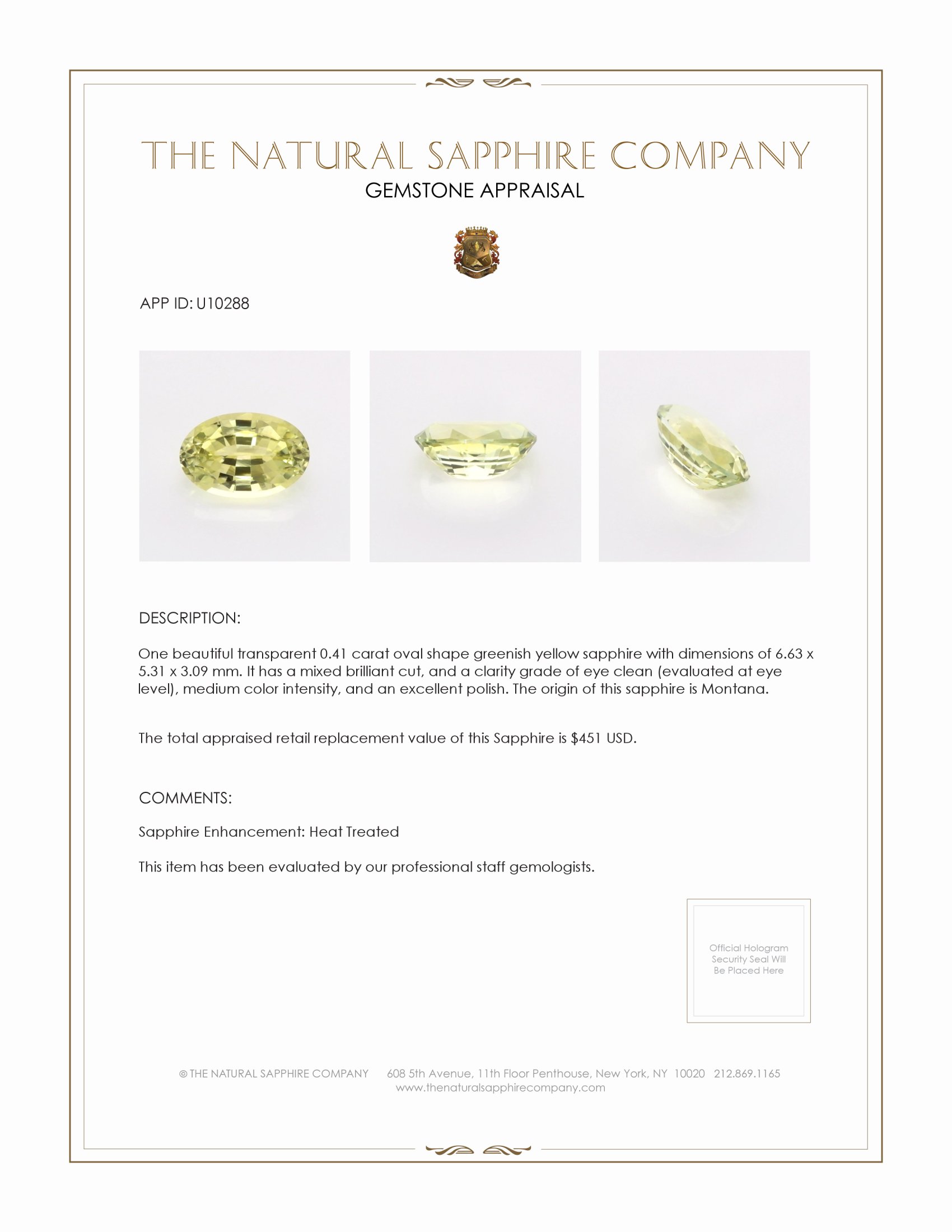 The presented gemstone is a transparent 0.41 carat oval-shaped sapphire, exhibiting a distinctive greenish-yellow hue that signifies both rarity and allure. With dimensions measuring 6.63 by 5.31 by 3.09 mm, this sapphire stands out not only for its exquisite appearance but also for its excellent potential as an investment asset. The gemstone boasts a mixed brilliant cut, a testament to the precision and skill involved in enhancing its natural brilliance and fire. Such a cut ensures that the gemstone catches and refracts light with exceptional elegance, all contributing to its overall visual appeal.