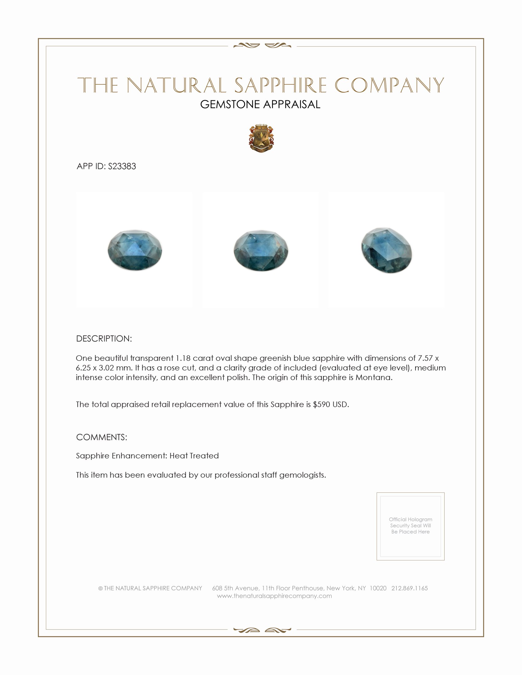 Discover the unparalleled allure of our exquisite greenish-blue sapphire, a gemstone that epitomizes rarity and exclusivity. At The Natural Sapphire Company, we pride ourselves on curating the finest selection of sapphires, each imbued with a unique beauty that sets them apart. This particular sapphire, weighing 1.18 carats, boasts a mesmerizing combination of green and blue hues. Its transparent oval silhouette measures 7.57 x 6.25 x 3.02 mm and is beautifully finished with a rose cut that enhances its natural allure. With a medium intense color intensity and excellent polish, this gem captures light in the most captivating way, making it a true jewel of distinction.