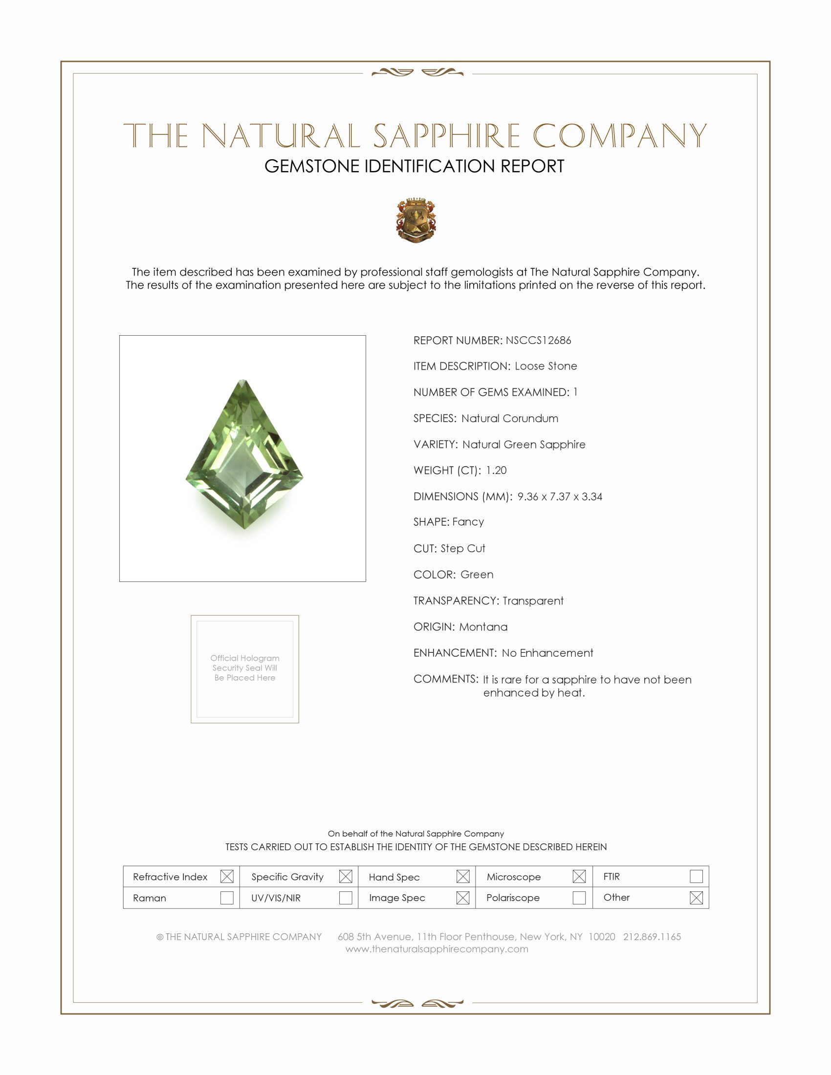 The Natural Sapphire Company presents a truly remarkable gemstone: a 1.20 carat fancy shape green sapphire originating from the picturesque terrains of Montana. Renowned for its extraordinary clarity and captivating hue, this gemstone is an exemplary choice for those seeking a gift that embodies elegance and rarity. The dimensions of this green sapphire are meticulously cut to 9.36 x 7.37 x 3.34 mm, which, together with its unique step cut, enhances its natural allure and emphasizes its brilliance from every angle.