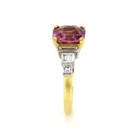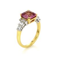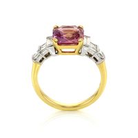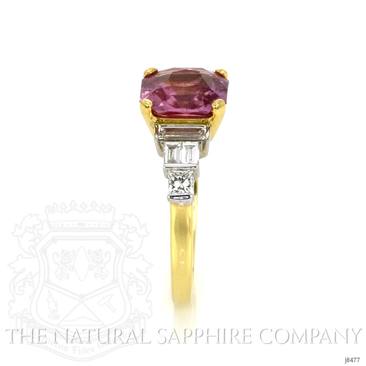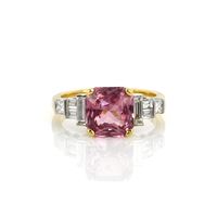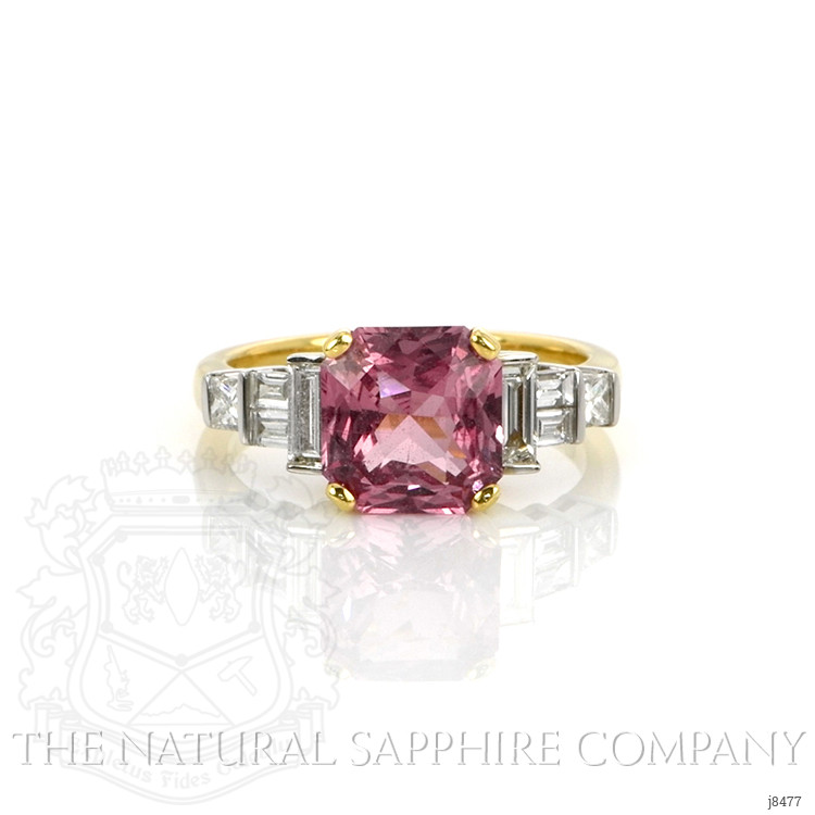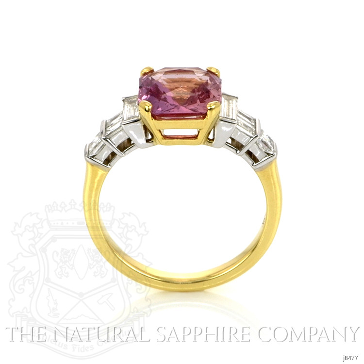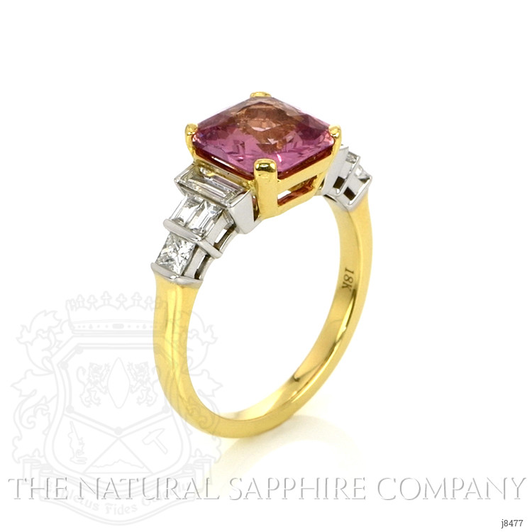 The ring primarily features a beautiful, transparent GRS certified 2.88 carat radiant shape padparadscha sapphire with the dimensions of 8.54 x 8.19 x 4.64 mm and is radiant cut. It has a clarity grade of very slightly included (evaluated at eye level), intense color intensity, and an excellent polish. The origin of this sapphire is Madagascar. Featured in the ring are 6 white baguette (straight) shaped step cut natural diamonds, weighing a total of 0.36 carats. The natural diamonds have a clarity grade of vs2 - Very Slightly Included., F color Also featured in the ring are 2 white princess shaped step cut natural diamonds, weighing a total of 0.17 carats. The natural diamonds have a clarity grade of vs2 - Very Slightly Included., F color The ring is entirely set in 18K white gold and 18K yellow gold.