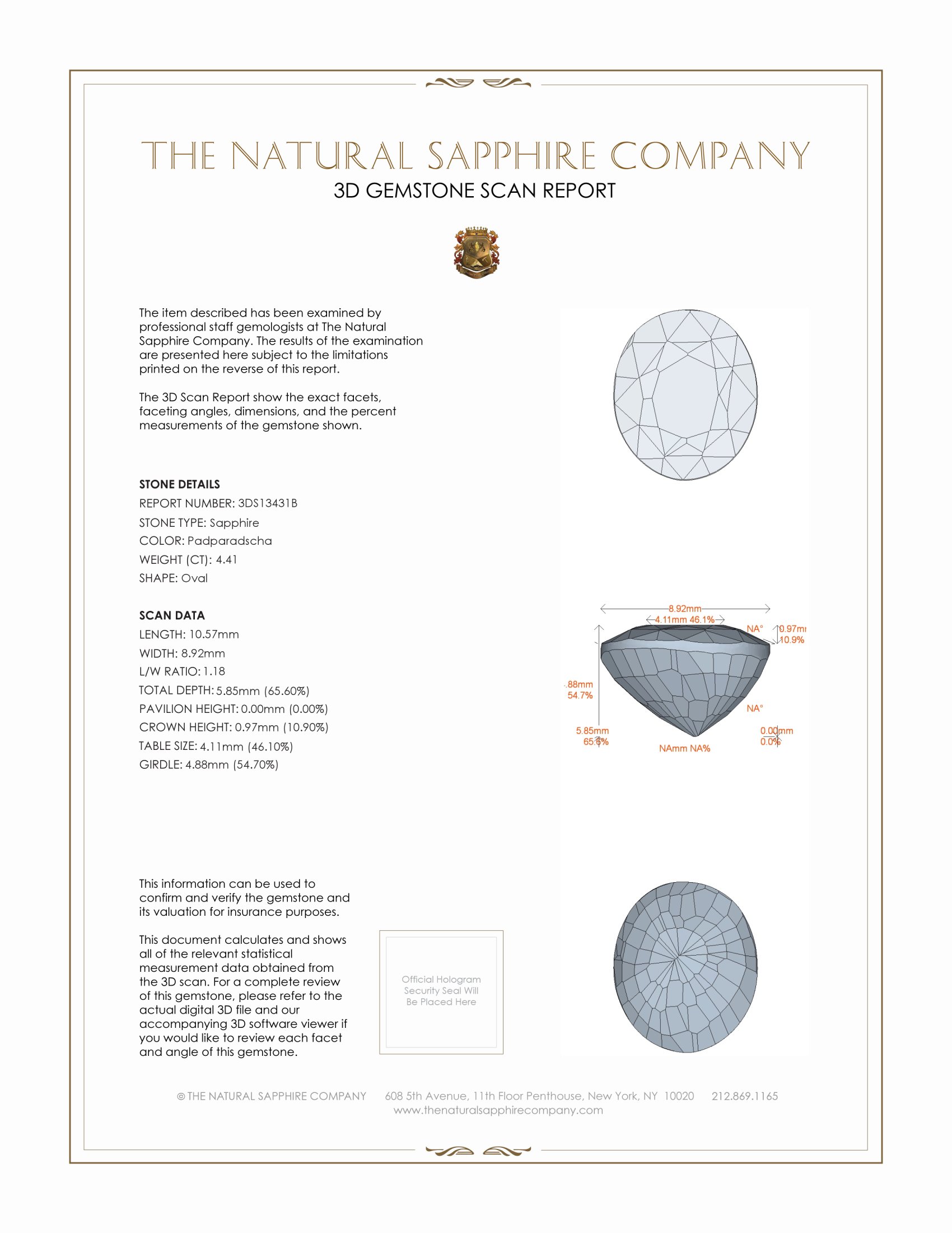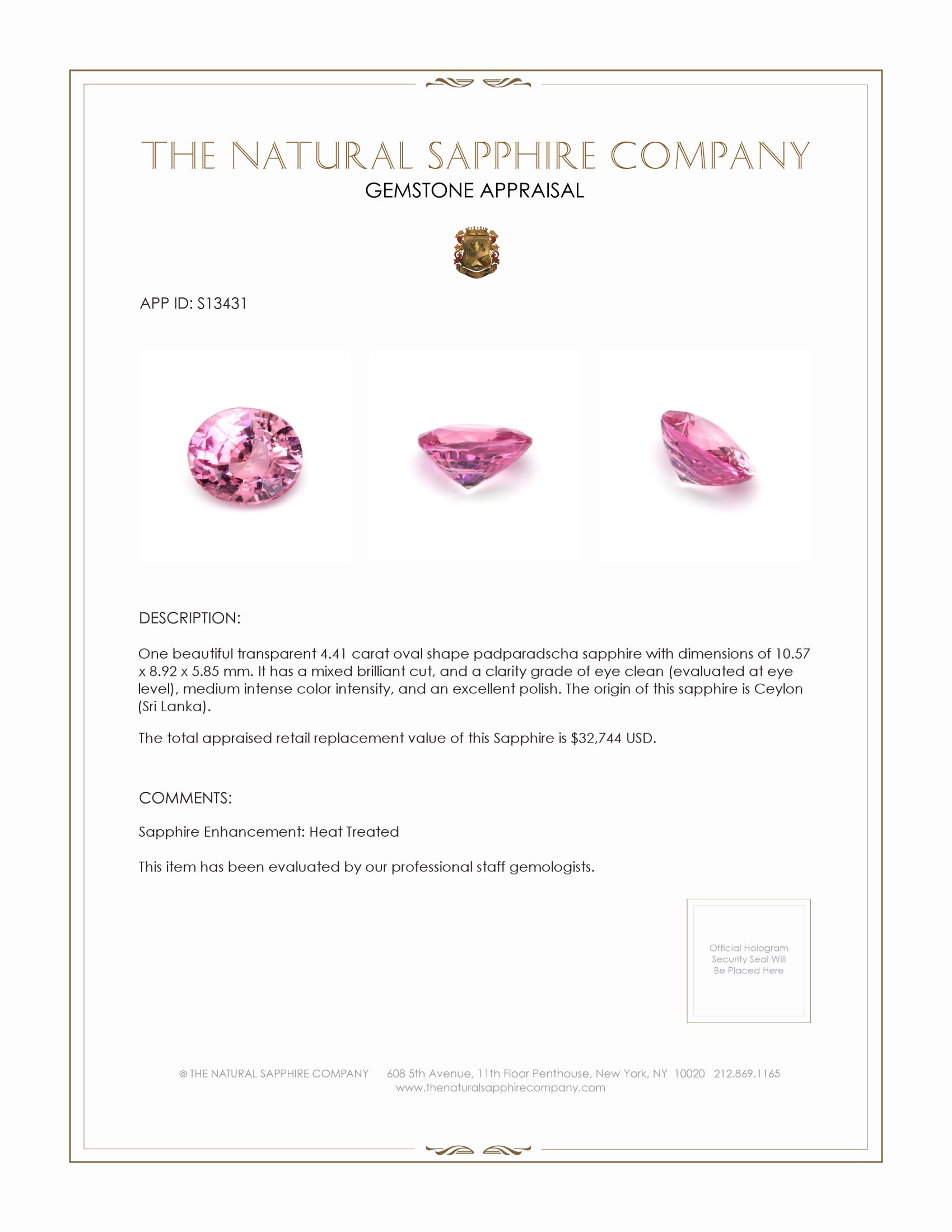 In the realm of exquisite gemstones, there exists a creation so breathtaking you would consider it touched by the divine, a jewel that transcends the mere trappings of transient beauty. Introducing the extraordinary 4.41 carat oval-shaped padparadscha sapphire, an emblem of timeless elegance and artistry. Evoking an aura of serene sophistication with its mixed brilliant cut, this sapphire captures the elusive twilight moments when the sun dips below the horizon. Measuring an elegant 10.57 by 8.92 by 5.85 mm, the gemstone showcases a harmony of proportions. Its medium intense color captures the delicate balance between the blush of an afternoon peach and the coral glow of a serene sunset, captivating hearts and drawing gazes from across the room.