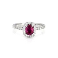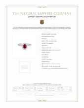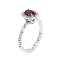 What was it about her that first captured your attention? Was it her natural beauty, sweetness, sharp intellect, or her whacky sense of humor ? When she has so many wonderful attributes, it is definitely hard to narrow it down to one or two. Perhaps it is more than enough to be grateful that she came into your life because now that she has, you feel happy and content, perhaps even proud to have her by your side. This charming sapphire and diamond ring in 14K white gold, with its 0.95 carat natural untreated cushion magenta sapphire from Kenya with vivid saturation, is accented with sixty one F colored diamond rounds totaling 0.35 carats. The decorated under gallery provides the finishing touch to this sparkling symbol of your new life together.