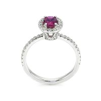 What was it about her that first captured your attention? Was it her natural beauty, sweetness, sharp intellect, or her whacky sense of humor ? When she has so many wonderful attributes, it is definitely hard to narrow it down to one or two. Perhaps it is more than enough to be grateful that she came into your life because now that she has, you feel happy and content, perhaps even proud to have her by your side. This charming sapphire and diamond ring in 14K white gold, with its 0.95 carat natural untreated cushion magenta sapphire from Kenya with vivid saturation, is accented with sixty one F colored diamond rounds totaling 0.35 carats. The decorated under gallery provides the finishing touch to this sparkling symbol of your new life together.