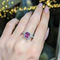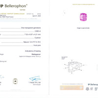 The ring primarily features a beautiful, transparent Other certified Vivid Pink 2.06 carat cushion shape pink sapphire with the dimensions of 7.32 x 6.57 x 4.21 mm and is mixed brilliant cut. It has a clarity grade of very slightly included (evaluated at eye level), vivid color intensity, and an excellent polish. The origin of this sapphire is Madagascar. Also featured in the ring are 36 white round shaped mixed brilliant cut natural diamonds, weighing a total of 0.55 carats. The natural diamonds have a clarity grade of vs1 - Very Slightly Included., F color The ring is entirely set in 18K white gold and 18K yellow gold.
