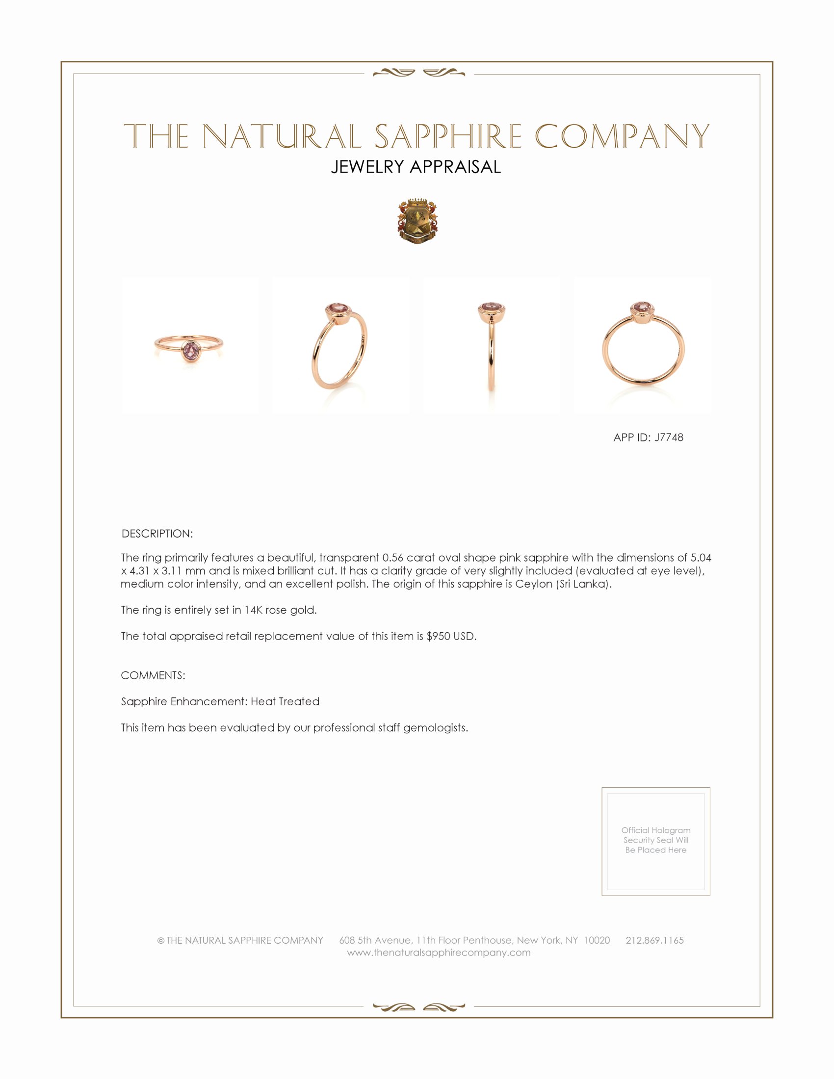 The ring primarily features a beautiful, transparent 0.56 carat oval shape pink sapphire with the dimensions of 5.04 x 4.31 x 3.11 mm and is mixed brilliant cut. It has a clarity grade of very slightly included (evaluated at eye level), medium color intensity, and an excellent polish. The origin of this sapphire is Ceylon (Sri Lanka). The ring is entirely set in 14K rose gold.
