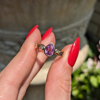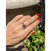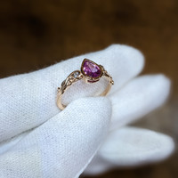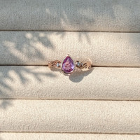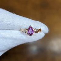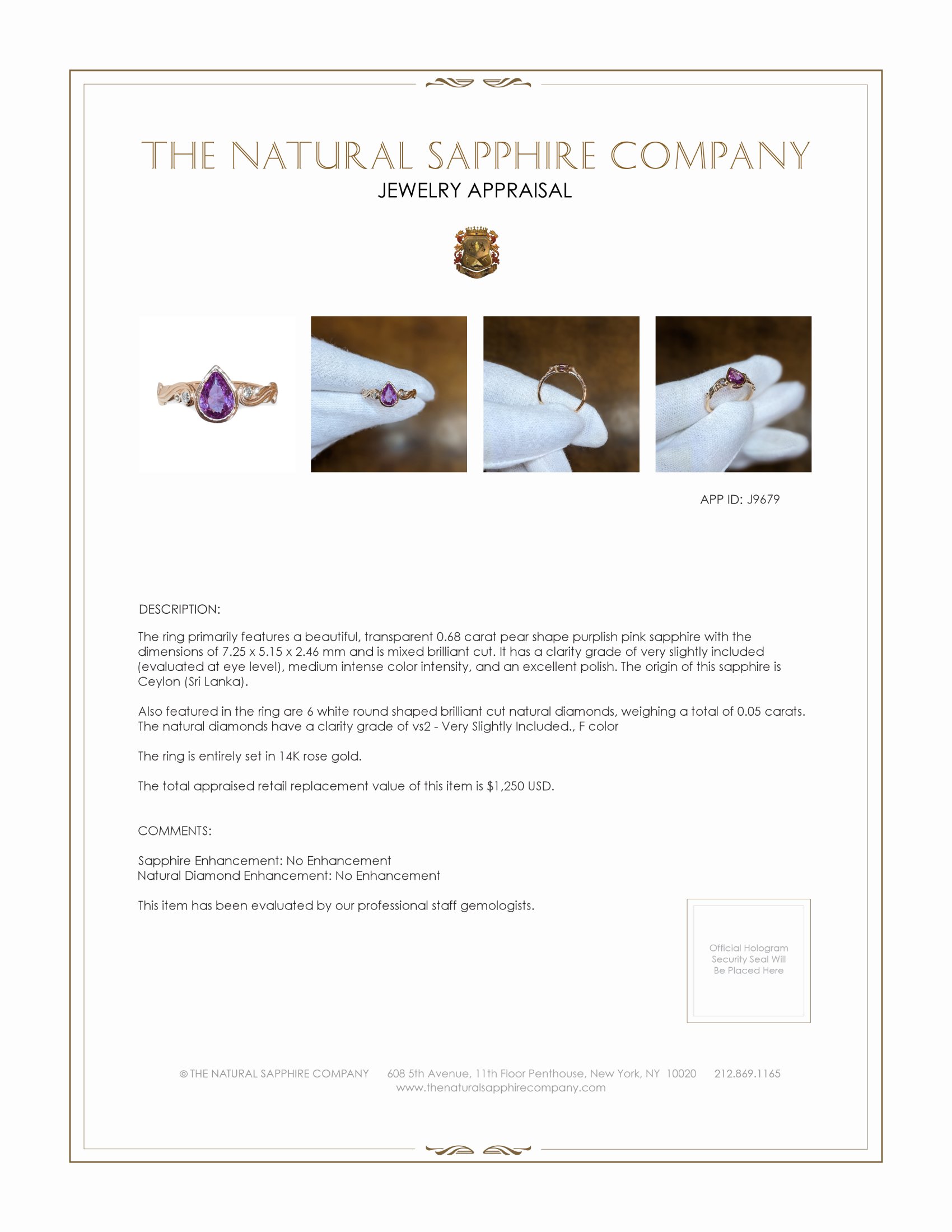 The ring primarily features a beautiful, transparent 0.68 carat pear shape purplish pink sapphire with the dimensions of 7.25 x 5.15 x 2.46 mm and is mixed brilliant cut. It has a clarity grade of very slightly included (evaluated at eye level), medium intense color intensity, and an excellent polish. The origin of this sapphire is Ceylon (Sri Lanka). Also featured in the ring are 6 white round shaped brilliant cut natural diamonds, weighing a total of 0.05 carats. The natural diamonds have a clarity grade of vs2 - Very Slightly Included., F color The ring is entirely set in 14K rose gold.