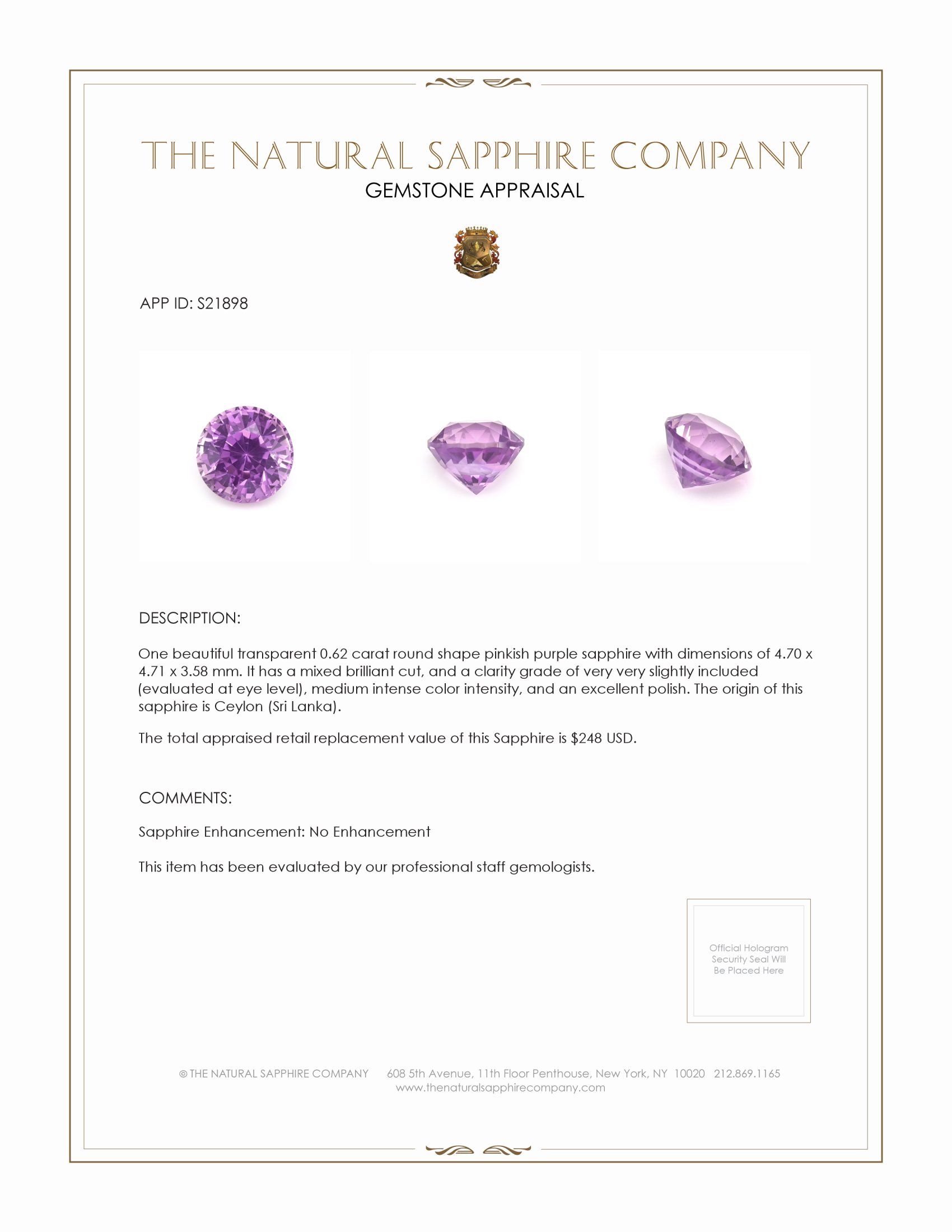 Discover the spellbinding allure of a gem that radiates an enchanting hue of pinkish purple, an exquisite treasure that can only be found in the heart of nature, not recreated in a lab. This breathtaking 0.62 carat round shape sapphire, sourced from the legendary island of Ceylon, now known as Sri Lanka, is more than just a jewel; it is a testament to the earth's most magnificent creations. Measuring 4.70 x 4.71 x 3.58 mm and boasting a mixed brilliant cut, this sapphire gleams with a medium intense color intensity, capturing the eyes and emotions of all who behold it. At The Natural Sapphire Company, we pride ourselves on offering our valued customers nothing but the genuine charms of nature, crafting everlasting memories that can be cherished for generations.
