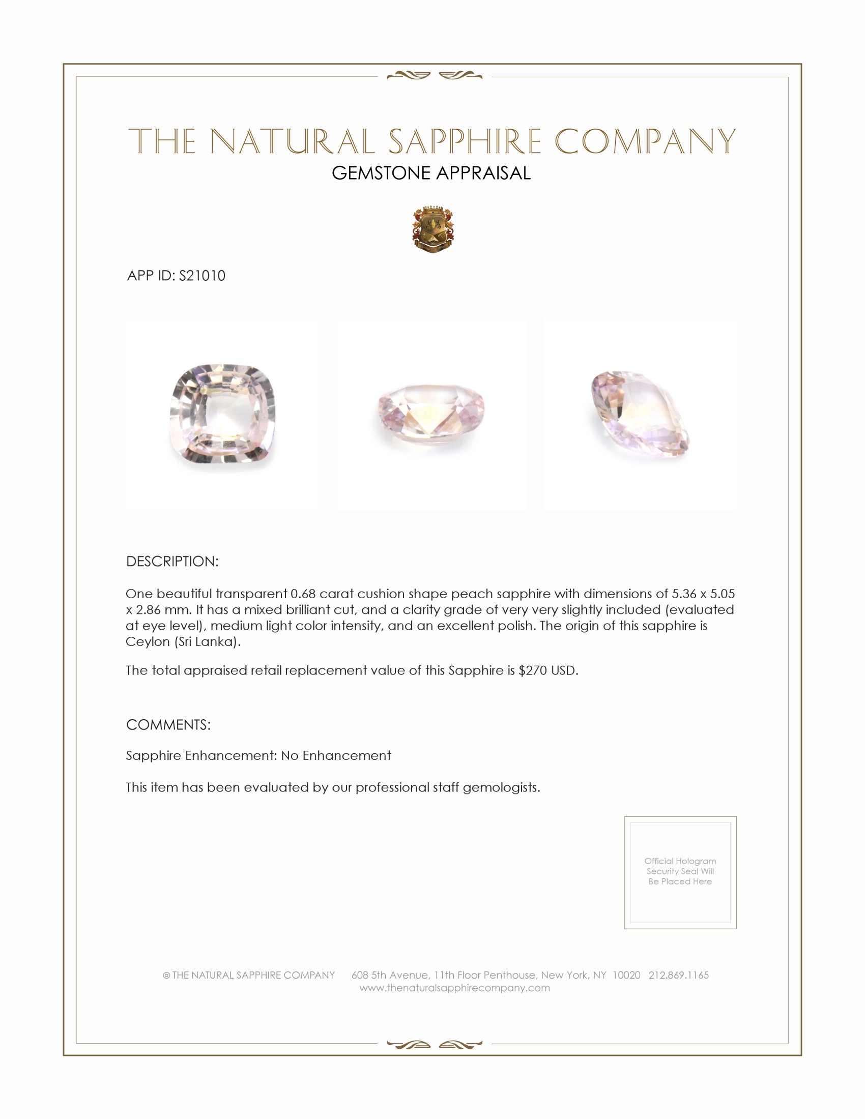 Allow yourself to be captivated by the enchanting allure of our exquisite peach sapphire, a gem that promises to bring joy and beauty to your jewelry collection. This stunning stone, crafted by nature in the heart of Ceylon, carries with it a story as profound and mesmerizing as its vivid color. Weighing 0.68 carats and delicately formed in a cushion shape, it captures light like a sunrise glistening over a tranquil sea, each facet pure and radiant. Its mixed brilliant cut provides a beautiful dance of light and shadow, evoking feelings of pure enchantment every time it graces your presence.
