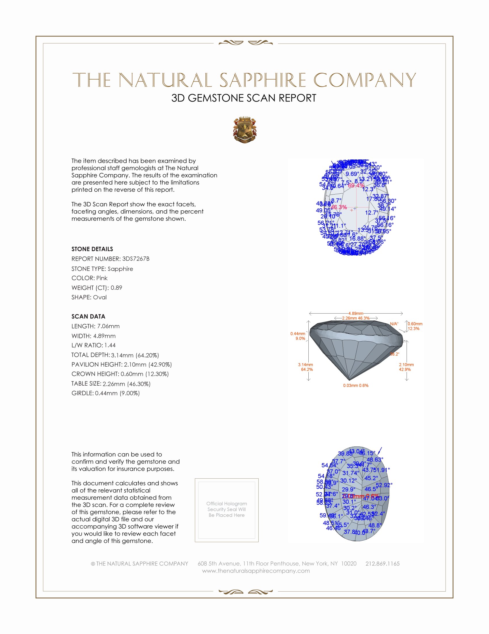 Discover a gem that transcends the ordinary, crafted by nature and perfected by human hands, an exclusive masterpiece by The Natural Sapphire Company. This exquisite 0.89 carat oval-shaped pink sapphire emanates a brilliance that effortlessly sets it apart from the more commonplace stones of the world. Captivating in its medium intense color intensity, this gem radiates a vivid pink hue, a symbol of elegance and romance that enchants the senses. Its dimensions, measuring 7.06 x 4.89 x 3.14 mm, reveal a stone meticulously shaped to reflect the optimal play of light, while its mixed brilliant cut ensures that every facet sparkles with perfection.